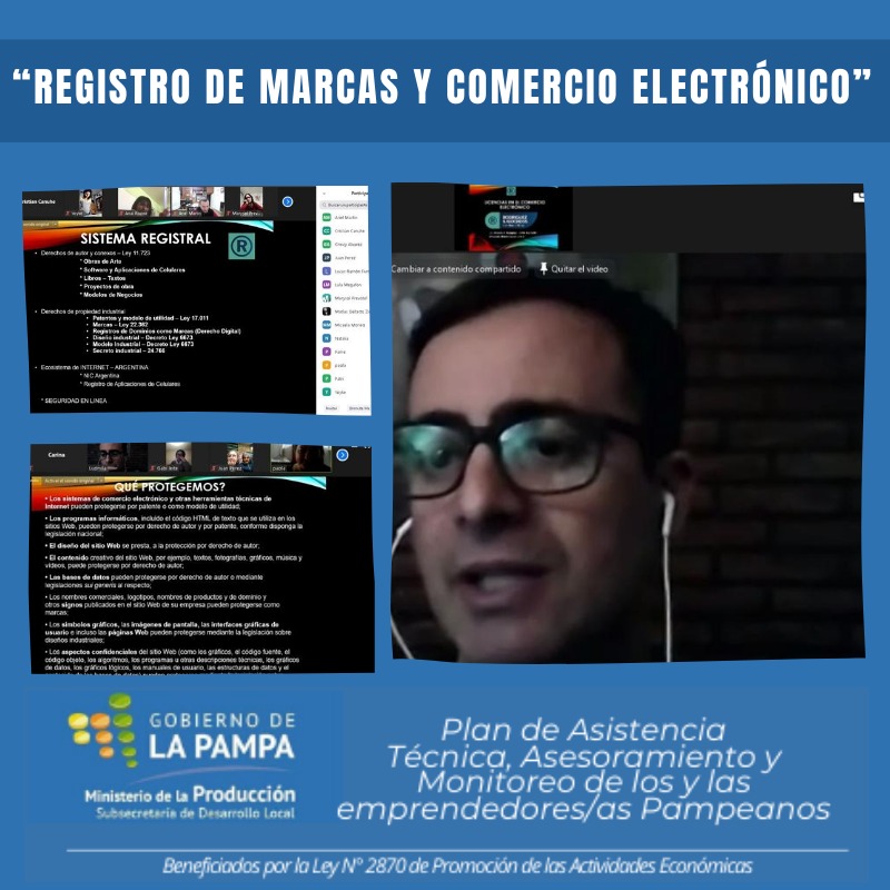 El Ministerio de la Producción, a través de la Subsecretaría de Desarrollo Local capacitó a emprendedoras y emprendedores de toda la Provincia sobre “Registro de Marcas y Comercio Electrónico”, a cargo del licenciado Mariano Rodríguez.En el marco del Plan de Asistencia Técnica, Asesoramiento y Monitoreo de los emprendedores, dicho organismo viene desarrollando un plan de capacitación, vía Zoom, con el fin de potenciar la capacidad productiva y de gestión comercial de los emprendedores pampeanos.