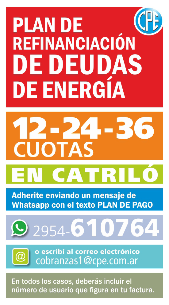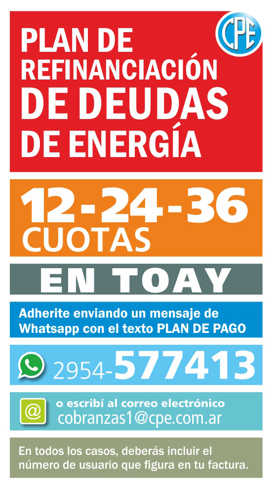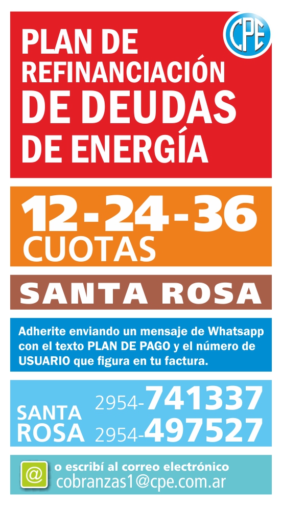 – para Santa Rosa: WhatsApp 2954-741337 y 2954-497527 o correo electrónico a cobranzas1@cpe.com.ar