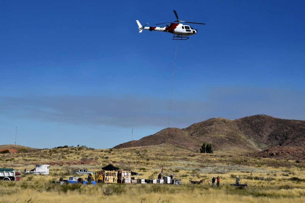 Entre materiales, infraestructuras, herramientas e insumos, la carga rondó los 11.000 kilos; y se dispuso de personal de Aguas del Colorado tanto en la base para armar las cargas como en la cima para efectuar las descargas.