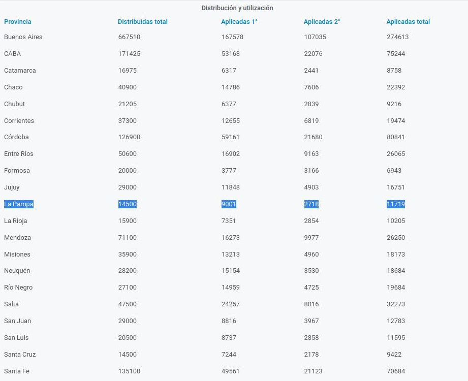 La provincia de La Pampa es la que más vacunas ha aplicado a su población, con 14500 dosis recibidas y 11719 aplicadas, con una eficacia del 80,82%.
