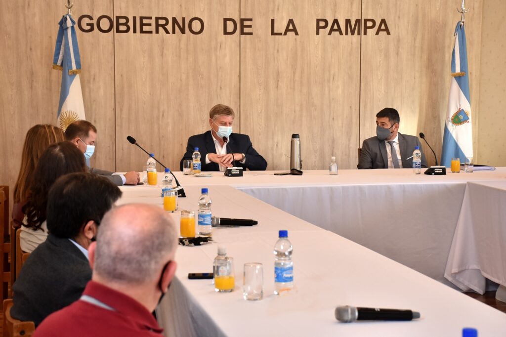 El mandatario encabezó la reunión junto al presidente del Banco de La Pampa, Alexis Iviglia; el Secretario y Promoción del Empleo, Marcelo Pedehontaá y el subsecretario de Ingresos Públicos, Alejandro Vicente.