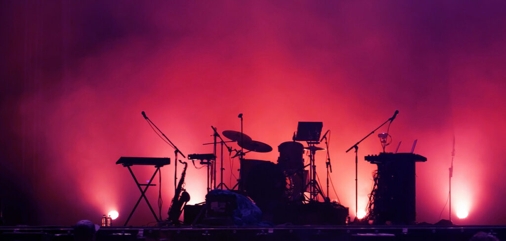 concert stage on rock festival, music instruments silhouettes, colorful background with copy space