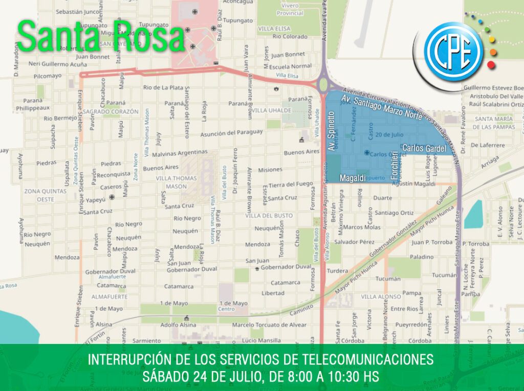 El Servicio de Telecomunicaciones de la CPE informó que este sábado 24 de julio, desde las 8:00 hasta las 10:30 horas, se interrumpirán los servicios de internet, televisión y telefonía en la zona delimitada por la avenida Santiago Marzo Norte, Carlos Gardel, Forchieri, Magaldi y Spinetto, del barrio Aeropuerto.