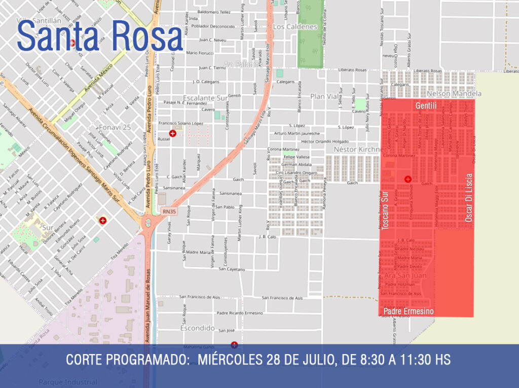 El mismo será en la zona comprendida las calles Gentili, Di Liscia, Padre Ermesino y Toscano Sur, abarcando los barrios Nelson Mandela, Esperanza, Pueblos Originarios y Ara San Juan. Personal de la CPE realizará tareas de mantenimiento en redes de media tensión. Estos trabajos se suspenderán en caso de lluvia.