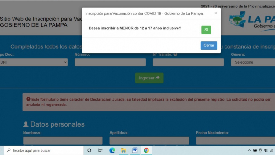 Ya se puede acceder al formulario de inscripción en el sitio vacunate.lapampa.gob.ar. Ante la inminente aprobación de vacunas para aplicar a menores de edad por parte de las autoridades nacionales de la materia, el Gobierno provincial comienza la inscripción para ese sector de la población.