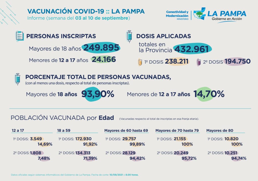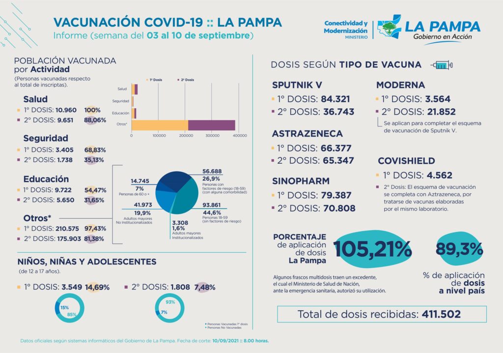 El Gobierno de La Pampa dio a conocer el informe semanal de la marcha del Plan de Vacunación contra la COVID-19 en la Provincia desde el viernes 3 al 10 de septiembre.