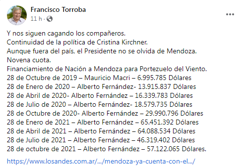 “Y nos sigue cagando un compañero”, tituló Torroba para enumerar los pagos de la administración de Alberto Fernández a la provincia de Mendoza para la construcción de la represa hídrica Portezuelo del Viento. En los últimos días, Nación giró el monto de la novena cuota por una suma de más de 57 millones de dólares.