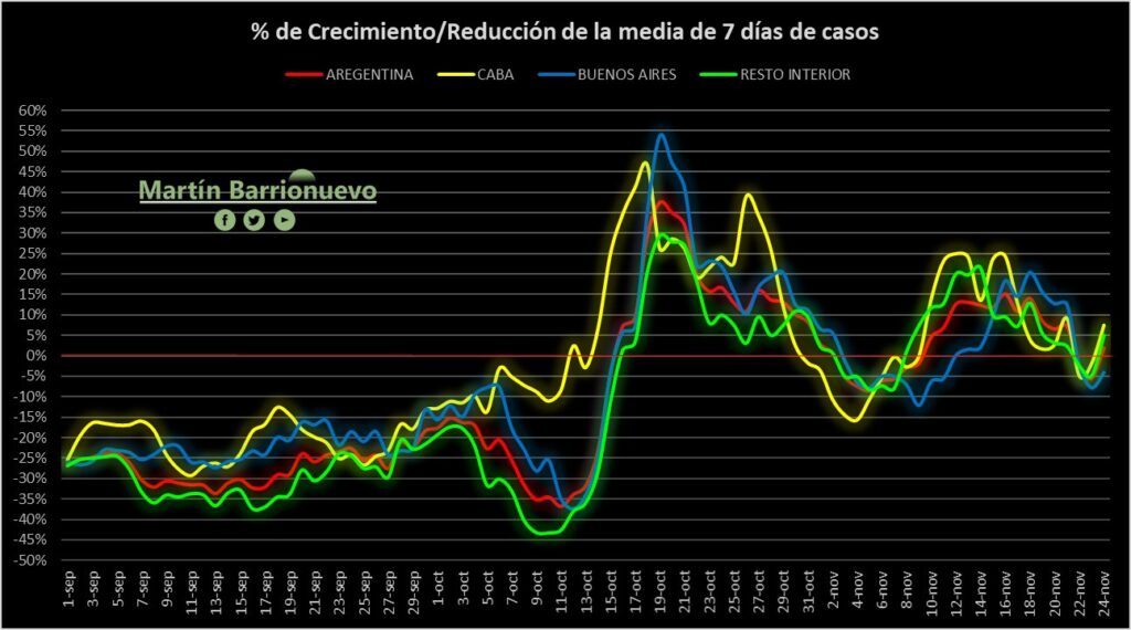 Ayer la media se ubicó en 1.264 casos positivos por día (con un total de 8.852 reportados entre el 17 y el 23 de noviembre), lo que representó una baja del 5,5% desde el martes anterior.