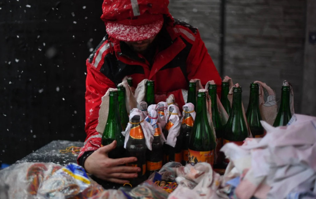 (VIDEO) Ucranianos han convertido la producción de bombas molotov en una actividad familiar y comunitaria.