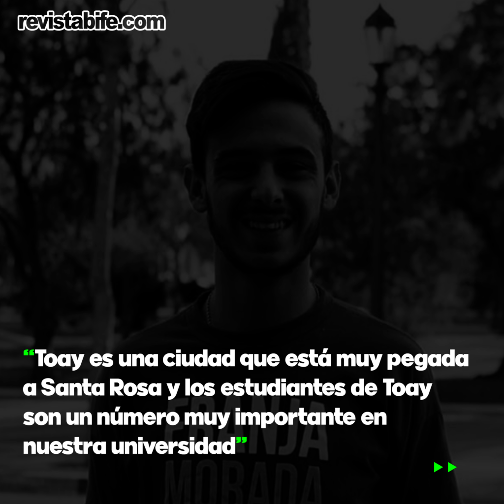 El dirigente estudiantil explicó que el proyecto para garantizar el viaje sin costo para estudiantes provenientes de la localidad aledaña a la capital pampeana, ingresará en la Cámara de Diputados a través de la legisladora Agustina García, quien supo tener un paso por la militancia estudiantil durante su formación universitaria, y justamente en Franja Morada. “Toay es una ciudad que está muy pegada a Santa Rosa y los estudiantes de Toay son un número muy importante en nuestra universidad”, justificó.