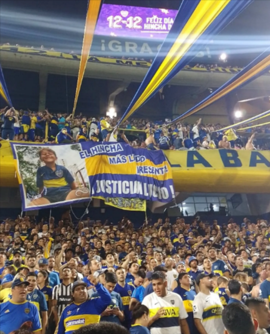 “El hincha más lindo presente”, es el texto impreso en la tela de grandes proporciones que muestra al niño vistiendo un conjunto con los colores del club que era hincha. “Justicia por Lucio”, sintetiza la imagen exhibida en la segunda bandeja, lugar de la hinchada del equipo del barrio de La Boca.