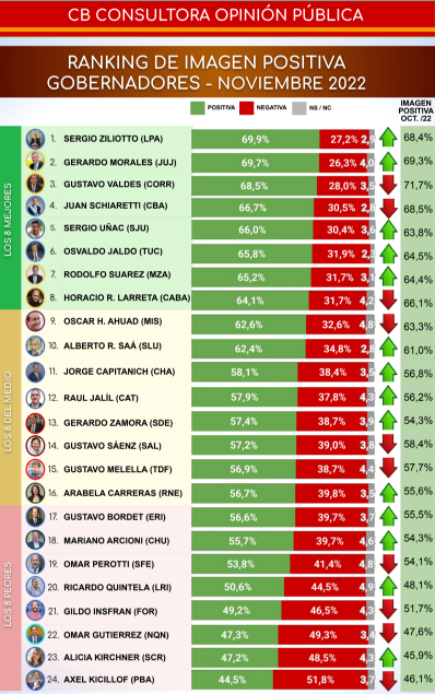 Los peores calificados de este mes son: Axel Kicillof de Buenos Aires (44,5%), Alicia Kirchner de Santa Cruz (47,2%), y Omar Gutierrez de Neuquén (47,3%).