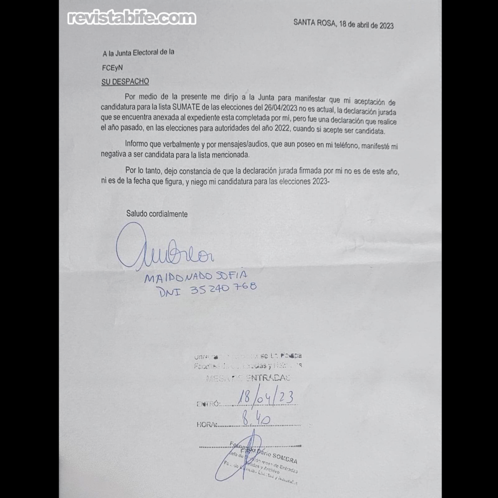 En la nota, la estudiante aseguró: “El cargo como Consejera Directiva que se hizo con mi nombre no fue con mi consentimiento, por lo tanto la firma no es auténtica”. Así está oficializado en el ACTA Nº4 de la Junta Electoral de la Facultad de Exactas y Naturales.