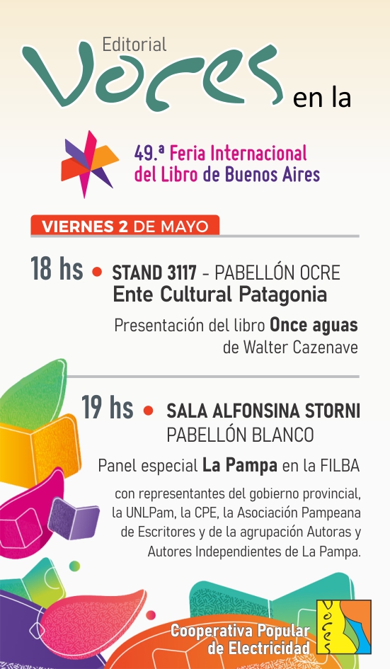 El próximo viernes 2 de mayo la CPE tendrá una doble participación. Por un lado, en el Pabellón Ocre, en el stand 3117 del Ente Cultural Patagonia —espacio que reúne a todas las provincias de nuestra región—, se llevará a cabo la presentación del libro “Once Aguas”-editado por Voces- del escritor Walter Cazenave. El investigador y docente también abordará la problemática de los ríos pampeanos. La presentación será a partir de las 18 horas en el auditorio del mencionado stand.