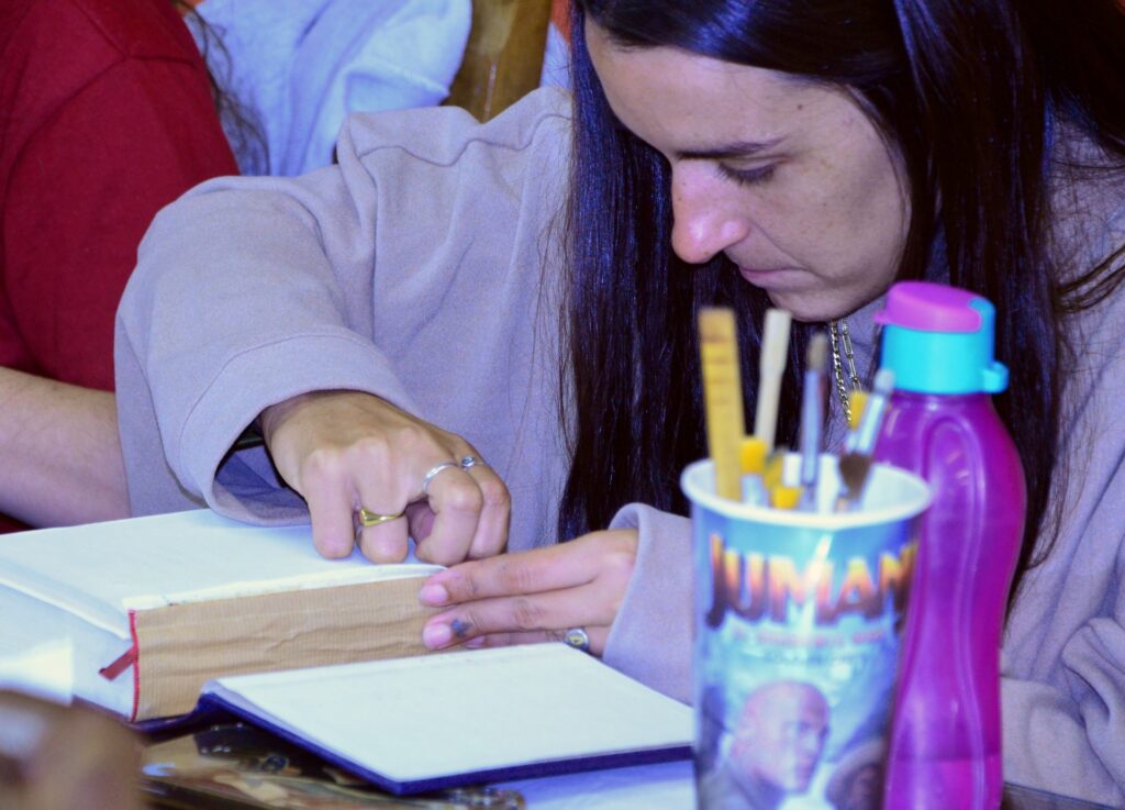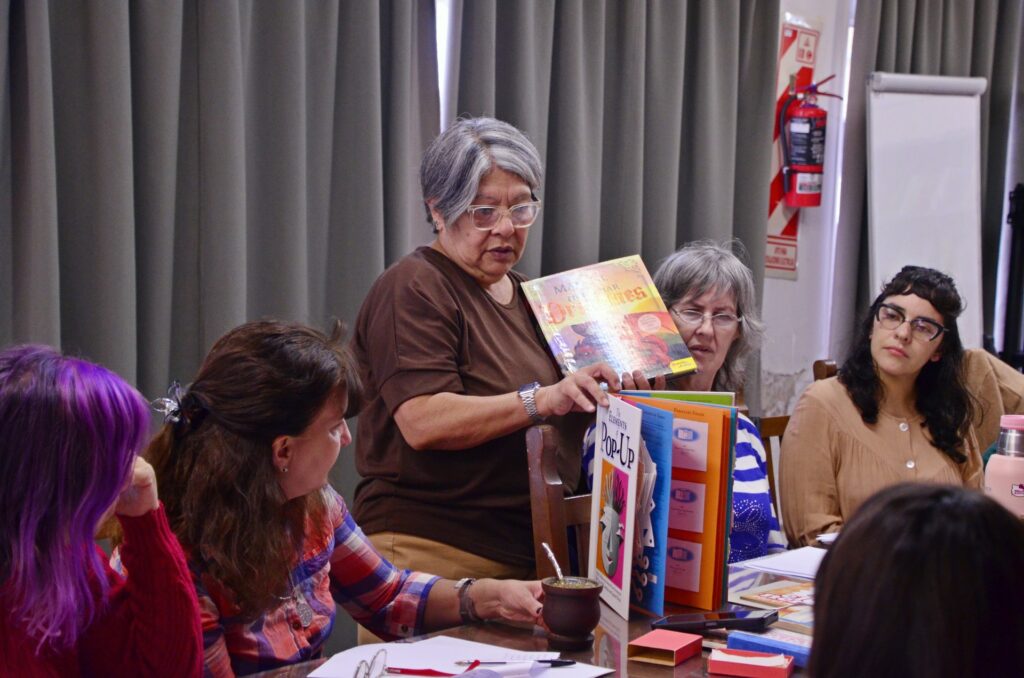 La capacitación estuvo a cargo de la docente Fernanda Álvarez, que trabajó sobre técnicas concretas: reparación de libros cosidos, recuperación de tapas y mantenimiento básico de ejemplares deteriorados.