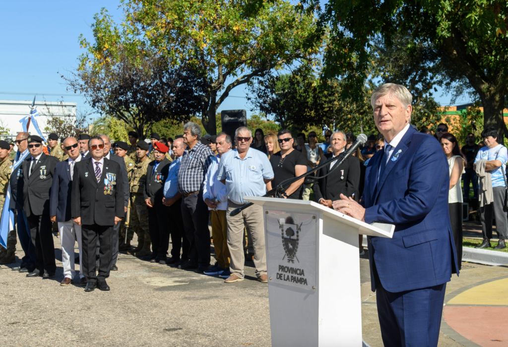 El acto se hizo en la plaza central, con presencia de funcionarios, legisladores, fuerzas de seguridad y vecinos. Hubo homenaje a veteranos pampeanos y también a excombatientes de Punta Alta.
